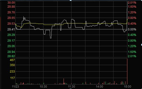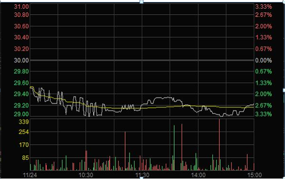 2011年11月23日臨近收盤期間(14:56:24至14:59:28),任某某為了在短期內(nèi)拉升股價,大量申報買入“X”4筆共計63,000股,占尾市階段市場申買量的比例高達(dá)75.54%;委托價格由29.60元升至32.00元,每筆均高于當(dāng)時市場上的買1檔價格,三分鐘內(nèi)將股價由29.35元拉升至30元收盤,拉升幅度達(dá)2.21%。(見下圖)